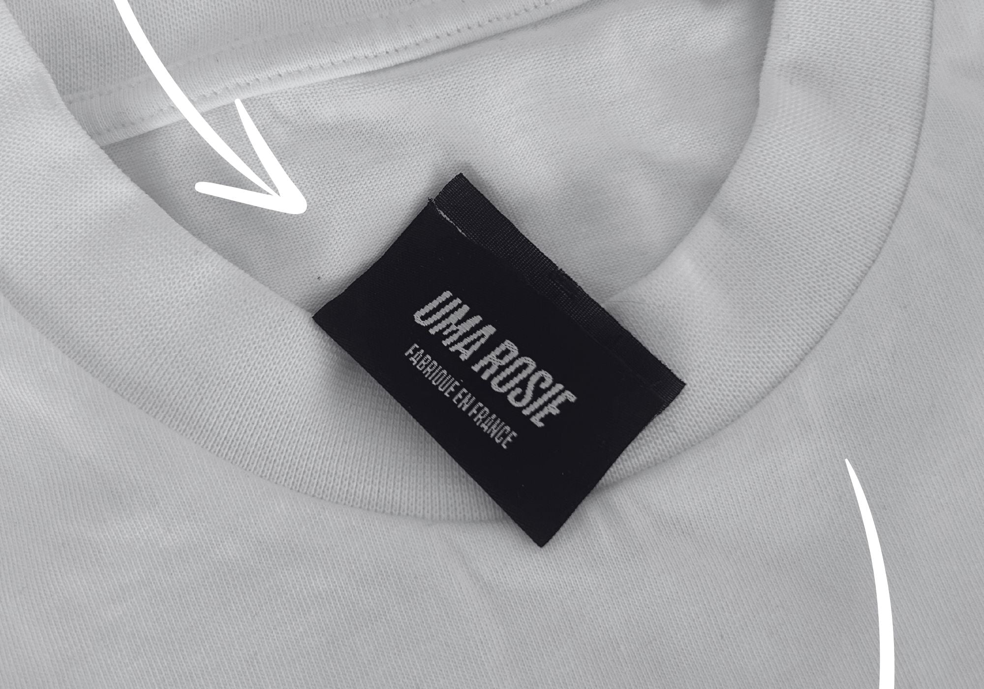Chaque étiquette est positionnée avec précision de manière à ne pas gêner le port du t-shirt tout en restant facilement accessible et lisible.